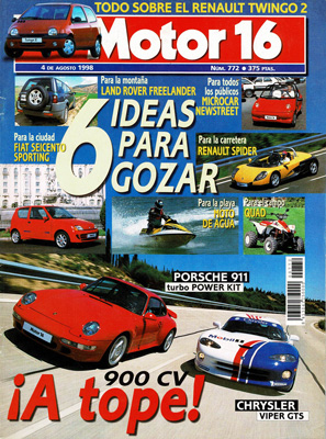 Prueba Comparativa: Chrysler Viper GTS/Porsche 911 Turbo Power Kit. 6 ideas para disfrutar del verano (Microcar Newstreet, Fiat Seicento Abarth, Renault Spider, Land Rover Freelander 2.0 Di, Motos de agua Kawasaki y Yamaha, Polaris: Motos y ATVs). Nuevo Renault Twingo 2. Magazin: Porsche cumple 50 años. Rallye Rías Bajas. BMW 320d Superturismo.