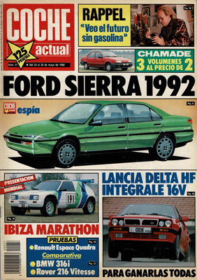 Ecos del Salón de Barcelona. Nuevo Renault 19 Chamade. Seat Ibiza Marathon, con motor V8 de 300 CV. Opinan los usuarios: Fiat Uno Diesel Super. Prueba Comparativa: BMW 316i/Rover 216 Vitesse. Fórmulas de promoción: correr con el utilitario. G.P. de Méjico de F1. Campeonato de España de Rallyes de Tierra. Prueba del Renault Espace Quadra. El futuro del automóvi, según Rappel. Contacto con el Lancia Delta HF Integrale. El coche de Victoria Vera.