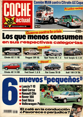 Nuevos modelos pequeños. Los coches que menos consumen. Café frente al volante. Prueba del Ford Sierra XR 4x4. Comparativa racing: Camión MAN/Citroën AX Copa. Prueba de la Yamaha FZR 1000 EXUP. Las peripecias del camionero.
