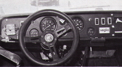 Doy la primera vuelta ligero y el habitáculo se llena de fuerte olor a gasolina; suerte que ya estoy acostumbrado. Al iniciar la segunda vuelta, ataco un poco y en la recta, antes de final de boxes, debo levantar el pie, ya que el desarrollo se queda un poco corto. Esto es debido al uso de neumáticos de perfil bajo, pues ya no existe ningún grupo diferencial más largo (9-35). En el final de recta del circuito Calafat hay una curva bastante rápida que con el Simca se puede pasar tranquilamente en cuarta velocidad a 7.500 vueltas, que deben ser 160 Km/h. aproximadamente. Pero luego viene la frenada más delicada del circuito. ¡Qué estupendos frenos! pensé: debo de frenar aquí, y me sobró espacio. Creo que el invento de Juncosa de mecanizar radialmente y soldar dos discos, aunque es una operación cara, el resultado bien lo merece; pues sin tomas de aire, para más aireación de los frenos, en las cuatro vueltas que di no noté ninguna pérdida de eficacia. No debo de pasar por alto que en estos coches se les ha montado en el tren posterior discos y pinzas de Seat, (en la ficha de homologación viene previsto el cambio de tambor a disco). Para tomar el ángulo y poder salir rápido, en esta ocasión reduzco a primera, ya que al ser bastante larga (66 Km/h.), permite salir más fuerte. En curvas lentas, como está el coche, tiene un comportamiento muy neutro gracias a la adopción de una ballesta más dura y plana en el tren anterior y muelles cortos, con ligera convergencia en el posterior, todo ello completado con unos amortiguadores Record. Aunque creo que con una barra estabilizadora trasera se conseguiría en zonas lentas hacerlo más manejable, pues se aguanta demasiado, en parte también es debido a los Firestone 7.0-20.0/13 que llevan montados delante y atrás en llanta 7" y 8" respectivamente, lo que provoca que se ponga en dos ruedas, con la consiguiente pérdida motriz, ya que cuando ensayamos el Simca todavía no estaba terminado el autoblocante.