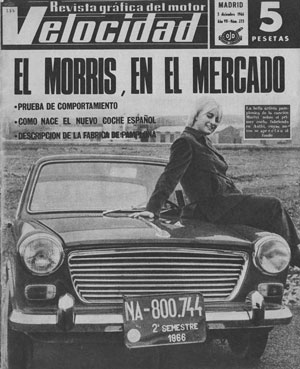 El Morris 1100, como se sabe, es un sedán de cuatro puertas y cinco plazas. Tiene una longitud de 3.73 m, anchura de 1.53 m y altura de 1.34 m. Su peso en vacío es de 810 kg, y admite hasta 1180 kg, es decir, hasta 370 kg mas, equivalentes a cinco pasajeros más una pequeña carga. Su figura es ya familiar, pues no es la primera vez que aparece en nuestras páginas ni en otros medios informativos. Por España rueda alguno que otr, importado en cupo anual, o con matrícula turística. De todas formas, las fotos que complementan esta información ayudarán a formarse una idea sobre el aspecto y dimensiones comparadas del coche. Es francamente bonito a simple vista, y como no lleva demasiada ornamentación, sino más bien lo estrictamente indispensable, su sobriedad contribuye a darle clase y elegancia. Destacan sus parachoques, de un brillo real, auténtico. Y es que están fabricados en inoxidable macizo. La ventaja de esto sobre el cromado es que ni se oxida ni salta en caso de golpe. Basta con enderezarlo y luego pulirlo para que el brillo aflore a la superficie. Cromados lleva el círculo que aloja, en el capó delantero, el escudo de la marca; una varilla por el centro del capó y la palabra Morris, que va situada a un lado, en la parte de atrás. Cromado y fabricados por Funyectal, con visos de indiscutible calidad. Respecto al escudo, que lo compone un toro inglés sobre tierra ondulada, emblema de Lord Nuffield, creador de la marca Morris, que aprovechó el emblema de la ciudad de Oxford, recibirá en España un toquecito de nacionalización, en el más amplio sentido. El toro inglés será sustituido por un toro navarro, y las ondulaciones de la tierra serán azules, como las olas del mar. Con ello se trata de representar la unión de Santander (mar) y Pamplona (toro navarro) para la realización del coche. Los colores, muy logrados, y respecto a su calidad creemos que ha quedado bien patente al explicar el proceso de pintura. Añadiremos, no obstante, que el grueso de pintura es de 125 a 140 micras. Para hacerse una idea, diremos que el Volkswagen, uno de los coches más robustos, tiene un grosor de pintura de 110 micras. Para juzgar el aspecto externo, pedimos parecer a Mariví. A ella le parece el coche pequeño, pero la convencemos de que dentro de su cilindrada y de su carácter utilitario, tiene las medidas ideales. Obtenemos pues, de común acuerdo, una calificación de MUY BUENO en este primer capítulo.