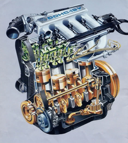 Para ello desechó, por un lado, el empleo del tan de moda turbocompresor y, por otro, el aumentar la cilindrada que podría penalizar el consumo, eligiendo el camino más sofisticado pero más técnico y que, a la postre, ha dado unos extraordinarios resultados. Conservar la inyección pero emplear cuatro válvulas por cilindro, con lo que con el mismo cubicaje de 1.781 c.c., se pasa de los ya citados 112 CV a 139. Como decimos, la gran novedad de este motor reside en una nueva culata, también de aleación como la anterior, pero que dispone de 16 válvulas que mejoran sensiblemente la «respiración» del motor, lo que se traduce en la práctica, además del ya mencionado aumento de potencia con respecto al motor antiguo, en una mayor respuesta y recuperación en regímenes de más usual utilización (entre 2.000 y 5.000 revoluciones) y todo ello con la misma relación de compresión.