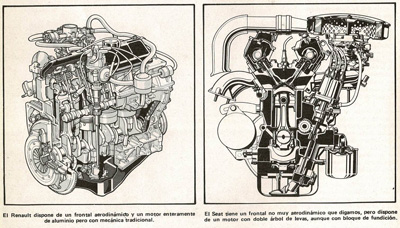 Vuelve a llamarnos la atención el motor del Renault, pues con una relación de compresión bastante alta para lo que se lleva hoy en día: 9,3 a 1, sin embargo obtiene tan sólo una potencia de 79 CV (DIN) a un régimen de 5.500 rpm; en cambio, el del Seat tiene una relación de compresión más holgada: 8,9 a 1, y la potencia sube a 95 CV (DIN) a 6.000 rpm.