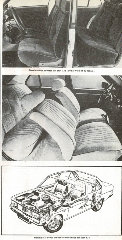 No hay discusión en cuanto al confort de los asientos, pues el superior mullido de los del R-18 inclina la balanza a su favor y ello es tal que nos atreveríamos a decir que hasta se pasa un poco de lo normal, pues al tomar las curvas nuestro peso, empujado hacia los lados por la inercia, vence la resistencia del cojín descolocando nuestra posición al volante. Por lo demás, ambos sujetan bien el cuerpo y van provistos de reposacabezas y cinturones de inercia, siendo sus tapicerías impecables. Como dato a alabar en el Seat 131, destacamos los reposacabezas en el respaldo del asiento trasero y el apoyabrazos central, y como crítica apuntamos que es incomodísimo abrochar los cinturones de inercia.