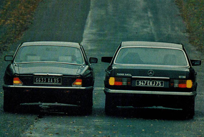 Aparte de esta "novedad", que no debería serlo desde hace varios años, nuestros dos competidores se mantienen fieles a los clásicos. El Mercedes, cuya presentación se remonta a 1979, ostenta las características de la aerodinámica moderna, a la vez que conserva un estilo e imagen que conectan con el público con más fuerza que nunca. Con casi 5 metros de longitud en la versión SE y 13 centímetros más en la SEL, el coche alemán resulta imponente exteriormente, lo que ya es un símbolo de lujo. Sin embargo, el volumen interior no se beneficia de estas generosas dimensiones, y el espacio disponible en la parte trasera es limitado, tanto en anchura como en longitud, lo que justifica plenamente la existencia de la versión de batalla larga que se muestra aquí.