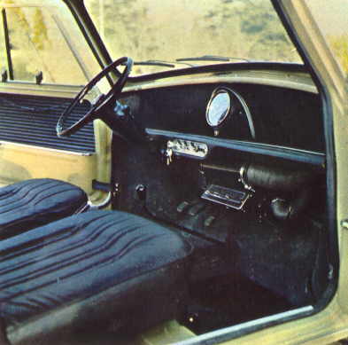 Acabamos de decir que el Mini 850 no desmerece en mucho del 1.000 Standard, al menos exteriormente. las. diferencias más sensibles, o las únicas, son ésa ya citada del anagrama, y la carencia de pilotos de intermitencia a los costados. En el interior, se advierte en seguida un marcado acento utilitario, pero eso es, ni más ni menos, lo que han pretendido, desde el primer momento, sus fabricantes. Los asientos son en skai, sustancia que utilizan otros fabricantes para modelos más lujosos, por lo que no cabe ponerle más reparo que el que el skai tiene de por sí; es decir, que resulta frío en invierno, y que hace sudar mucho en verano.