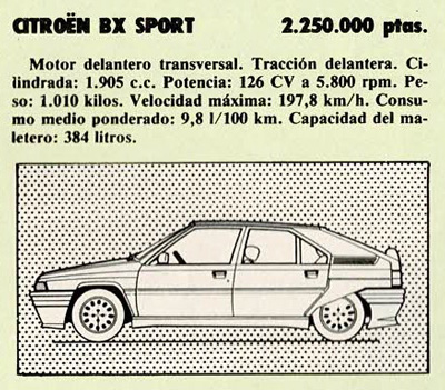 En la actualidad, la gama del Citroen BX en sus versiones de gasolina la constituyen, en cuanto a motorizaciones, el 14 (72 CV), el 16 (92 CV) y el GT (105 CV), todos ellos, fabricados en España. Desde hace un par de días se añade un nuevo elemento más, lamentablemente -por su precio- importado de Francia, con ya una más que respetable cifra de caballos: 126. Se trata de un experimento de la marca, encargado a un preparador del prestigio de Danielson y en un número limitado de unidades, pero que constituye una realización brillantísima, capaz de superar los 200 kilómetros por hora (en condiciones favorables), llamada a potenciar la imagen del BX como automóvil también deportivo.