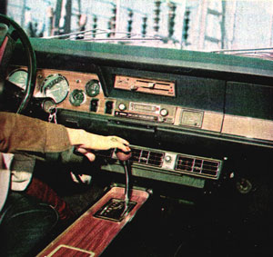 En España tuvimos una primera experiencia de este tipo con un vehiculo fabricado también por Chrysler concretamente el Simca 1000 de cambio semiautomático, que, aunque se vendió en muy pequeñas cantidades dio un gran partido y agradó bastante a sus propietarios. Ahora nos encontramos con algo que es ya bastante más serio, pues el sistema de transmisión automática que equipa este Dodge 3700 GT está completamente automatizado y, por lo tanto, supone muchas más y mejores, ventajas. Concretamente, es una caja “Torqueflite”, modelo A-904, de tres relaciones y con un selector situado sobre la consola central con seis posiciones: P (aparcar), R (marcha atrás), N (neutro o punto muerto), D (utilización normal), 2 (retención normal), 1 (retención máxima). Aparte de esta posibilidad manual, el cambio actúa automáticamente según sea la presión aplicada sobre el pedal del acelerador, bien para conseguir la utilización más correcta (media presión), bien para rodar de la manera más económica (mínima presión) y también para conseguir las máximas aceleraciones (máxima presión).