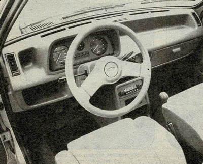 La excelente accesibilidad al interior del Fiesta nos permite observar con agrado un tapizado distinto y, sobre todo, unos asientos muy envolventes. Como suele ser norma, son algo duros, lo que nos hace pensar en la hasta ahora habitual dureza de suspensión de los Fiesta y el resultado final en cuanto al confort se refiere. Pero no nos adelantemos. El velocímetro graduado hasta 220 km/h. y el pequeño volante de dos radios nos confirman la imagen exterior. Por lo demás, el equipo es amplio: parabrisas laminado, limpialuneta térmica, reloj digital con calendario y crono, guantera con luz, lavaparabrisas eléctrico, cuentarrevoluciones, etcétera.