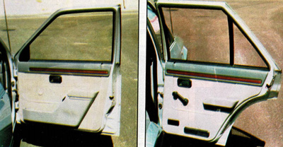 Los paneles de las puertas están realizadas siguiendo la línea de la tapicería de los asientos y se hallan rematados por unas finas decoraciones en imitación madera. Las puertas delanteras llevan bolsas rígidas portaobjetos y los mandos de los elevalunas eléctricos.