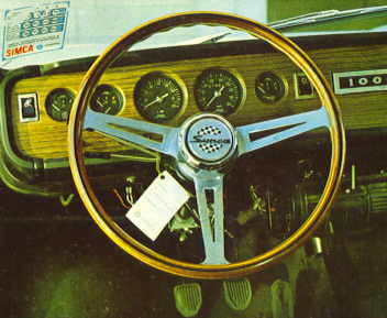 Lo primero que nos llama la atención del Simca 1.000 GT es la bonita, aunque escasa, gama de colores en que se ofrece al público. En segundo lugar, nos fijamos en el tablero de a bordo que es de los más completos que se fabrican en España, si bien para nuestro gusto los relojes, y en particular el del cuenta vueltas, son demasiado pequeños. El volante de madera hará las delicias de muchos mientras que otros lo notarán un poco resbaladizo, y nosotros lo encontramos bien, aunque no nos gusta el cromado del volante puesto que nos refleja muy a menudo el sol en los ojos.
