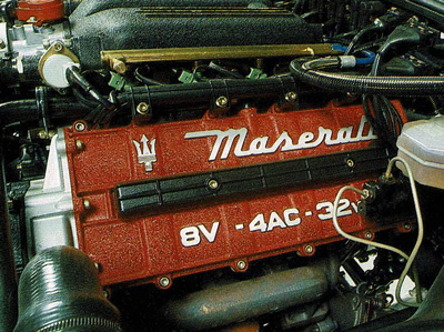 El motor del 222 SR sólo se parece al del Shamal en los dos turbos, porque lo demás es muy distinto. Es un seis cilindros, también en V, pero con culata de tres válvulas por cilindro y una cilindrada de 2,8 en lugar de 3.200 centímetros cúbicos. La potencia es de 225 caballos debido al catalizador (250 sin él) y la sensación, al igual que en el Shamal, es de una entrega de potencia brusca y una aceleración inmediata. La caja de cambios es de cinco velocidades con la primera hacia abajo.
