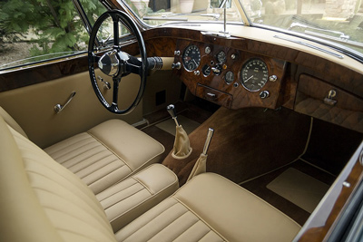 En su reducido habitáculo, muy bien cuidado, destacan los asientos de piel, el enorme volante de cuatro aspas situado a la derecha que incorpora en su núcleo central los mandos de los intermitentes V el clásico cuadro de instrumentos sobre madera barnizada del más puro estilo inglés dominado por los dos grandes Smiths, cuenta revoluciones con reloj horario incorporado y cuenta kilómetros, completados por tres relojes circulares de pequeño diámetro que indican presión de aceite y temperatura de agua en la misma esfera, amperímetro y el indicador de gasolina, en el centro está el conmutador de luces y en la parte superior izquierda el botón de arranque, todo este conjunto está completado por los habituales mandos de aireación y calefacción.