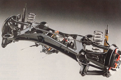 En el caso del 190E, quizás no es propio decir que se esté cobrando específicamente su compacidad. Este proyecto, que como antes decíamos ha sido pensado y repensado antes de su lanzamiento, ha respondido perfectamente a las excelencias que se esperan de Mercedes; pero para ello ha entrañado una importantísima inversión, en orden a que su producción suponga, no una sustitución de los Mercedes ya conocidos, sino una fructuosa adición. Y también ha debido costar un riñón el proceso de definición y desarrollo del nuevo modelo, en el que se han aplicado notables mejoras de aerodinámica y suspensión. La suspensión posterior, como se sabe, es lo más novedoso y destacable de la concepción del 190E. Dentro del mantenimiento de una estructura clásica, con motor delantero y ruedas traseras motrices, no cabía esperar algo más perfeccionado que este tren trasero en el que cada rueda va guiada por no menos de cinco brazos; con ellos, se atiende al mejor compromiso cinemático, en el que se han previsto todas las necesidades de guiaje y la neutralización de los posibles efectos parásitos, incluyendo los cambios de ángulo y por supuesto los fenómenos de aplastamiento de suspensión en aceleración y levantamiento de frenada. El tren delantero tipo MacPherson (pero, al igual que el trasero con muelles y amortiguadores no concéntricos) igualmente comporta un efecto anti-picado en frenadas.