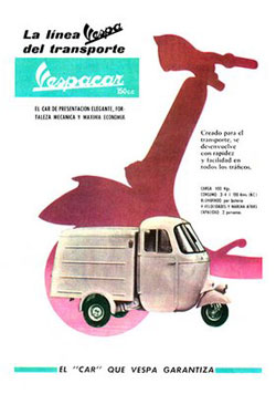 Fue en enero de 1947 cuando se puso en producción el «Vespacar» en Italia. Derivado de la popular motocicleta, tenía un sentido económico y práctico en su empleo.