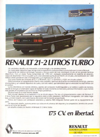 Con la aparición de este modelo, del que por cierto se rumorea puede ser el último Renault motorizado con turbo-compresor, se da quizás el penúltimo paso en la evolución de la gama 21 a la espera de las cuatro ruedas motrices. De todas maneras, este tracción delantera nos permite disfrutar de una amplia versatilidad, disponiendo a la vez de un vehículo familiar y de una berlina deportiva en función simplemente de nuestros deseos o de las ganas de experimentar fuertes emociones.