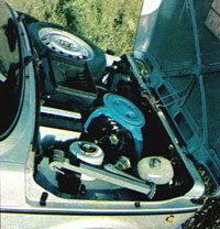 El tercer circuito es de mando mecánico, de gran eficacia, con palanca manual situada en el suelo y que actúa sobre los tambores de las ruedas posteriores. Un interruptor, conectado bajo el pedal, avisa ópticamente, mediante dos faros de luz roja, a los conductores que marchan detrás, la actuación de los frenos.