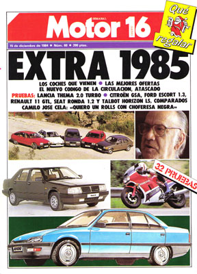 EXTRA 1985. Prueba Comparativa: Citroën GS X1/Ford Escort 1.3 Laser/Renault 11 GTL/Seat Ronda 1.2 GL System Porsche/Talbot Horizon LS. Fuera de serie: Aston Martin DB6. Prueba del Lancia Thema i.e. Turbo. Las novedades de 1985. Mi primer amor: José Sacristán. 23 pruebas de motos. Gente sobre ruedas: Camilo José Cela. Viajes: de Lanzarote al centro de la tierra. 1000 Km de Sandown Park. Rallye RACE Centro.